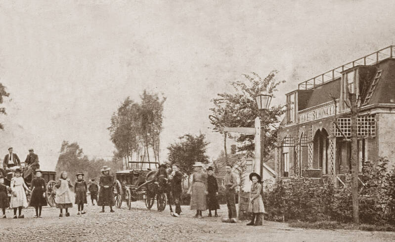 Links: Einde Oosteinderweg, linksaf Bosrandweg, rechts Schinkeldijkje en rechtdoor de Kleine Noorddijk. Rechts Café Schinkel, kijkend richting Aalsmeer