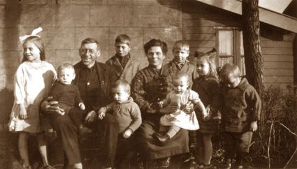 Links: Kleine Noorddijk 80, boswachterswoning, daarvoor het Zwarte Pad. Rechts: Het gezin van Gerrit Stokkel en Wilhelmina Jozina van Eijk voor hun huis aan de