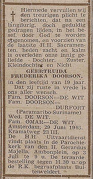 12. Alexander Johannes Frederik DOORSON (DURFORT), geboren te Paramaribo, Suriname op 4 februari 1892, overleden op 15 december 1980 te Amsterdam, zoon van Nicodemus Doorson (24) en Jacqueline Margaretha Durfort (25), beroep arbeider, machinebankwerker