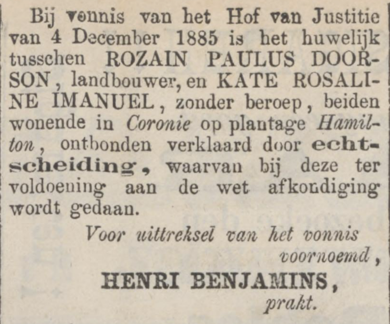 24. Nicodemus DOORSON, geboren te Suriname, Coronie op 3 september 1876, overleden op 17 augustus 1930 te Paramaribo, Suriname, zoon van Rozain Paulus Doorson (48) en Kate Rosalina Imanuel (49), geloof R.K., beroep gouddelver, arbeider in de goudvelden