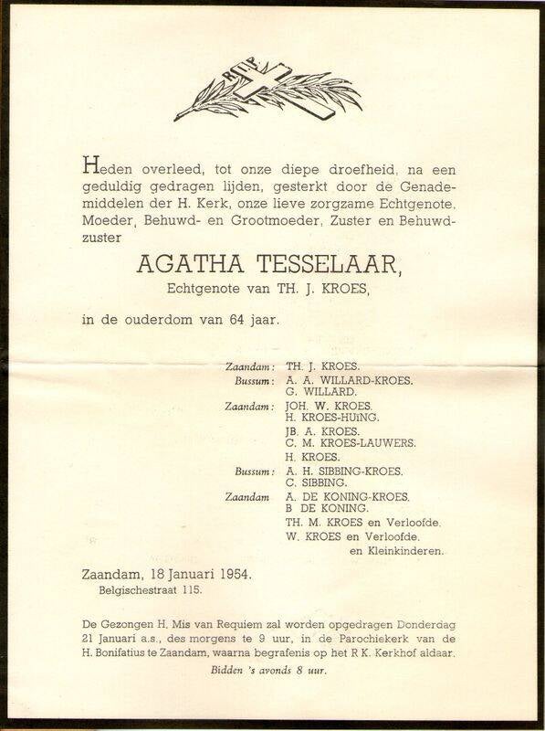 Met dank aan Mariёtte Tesselaar voor de gegevens van de nazaten van Jan Tesselaar en Cornelia Bleeker, Stichting Roomsche Santjes Oegstgeest, Rens Franken, zr. Veronie Franken (Truus), Dick Tesselaar, diversen aanvullingen van Wil Braam (voor de oudste gegevens), Fred Groot, Casper Bot, Jos van Rijn, Jaap Kok, Jan Brink en Linda Groot Oud, de site 'Noord-Hollandsche Huwelijcken' van Gertie van Lienen-Visser en Ineke Smit. De aanvulling voor wat betreft de familie Tessel heb ik ontvangen van Inga Tessel. Aanvulling familie Thesselaar komt van Ton Thesselaar.